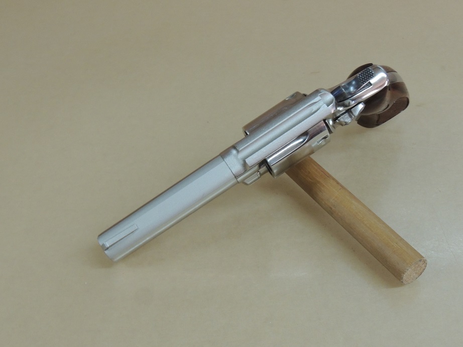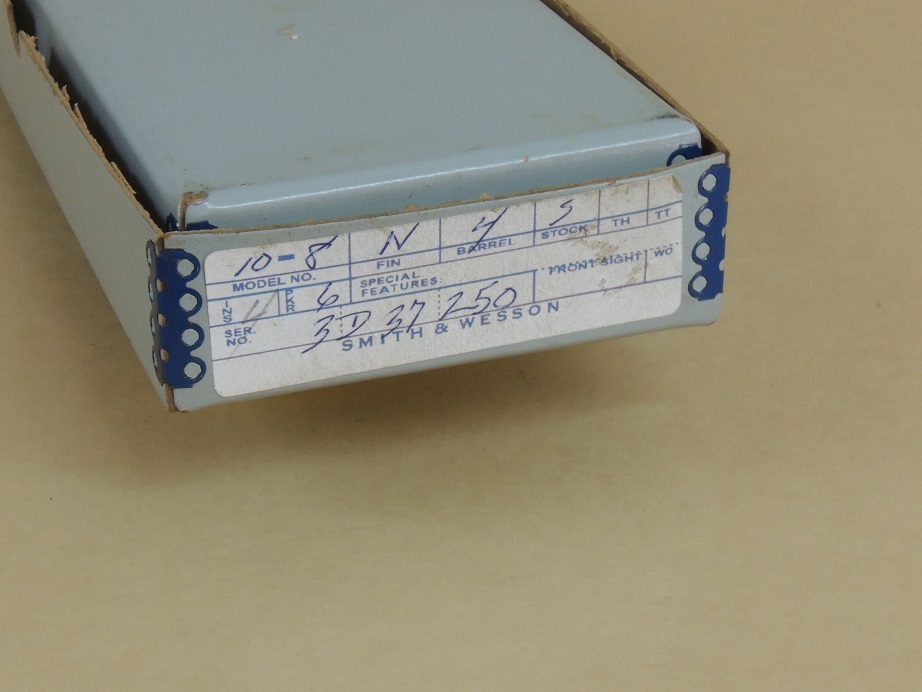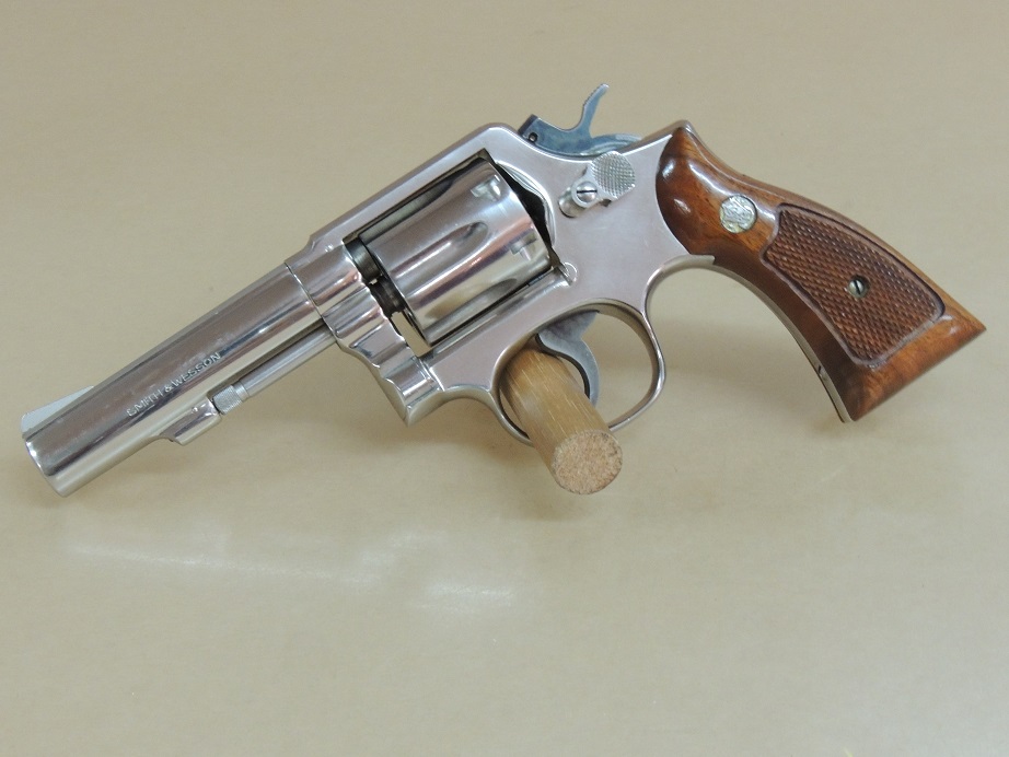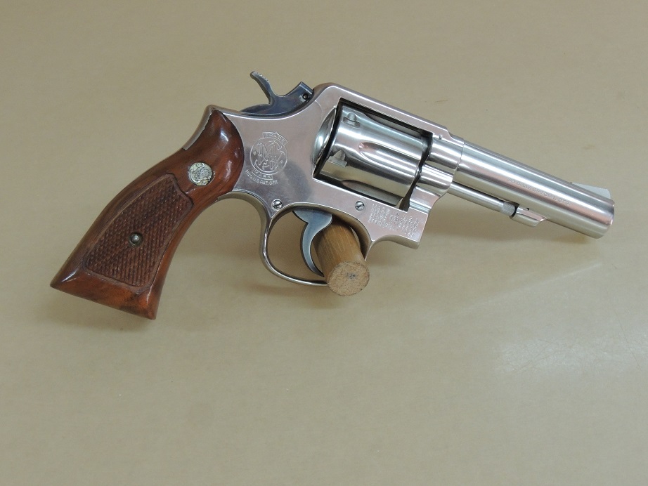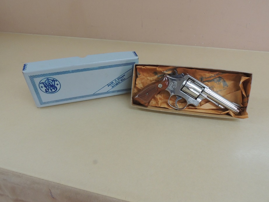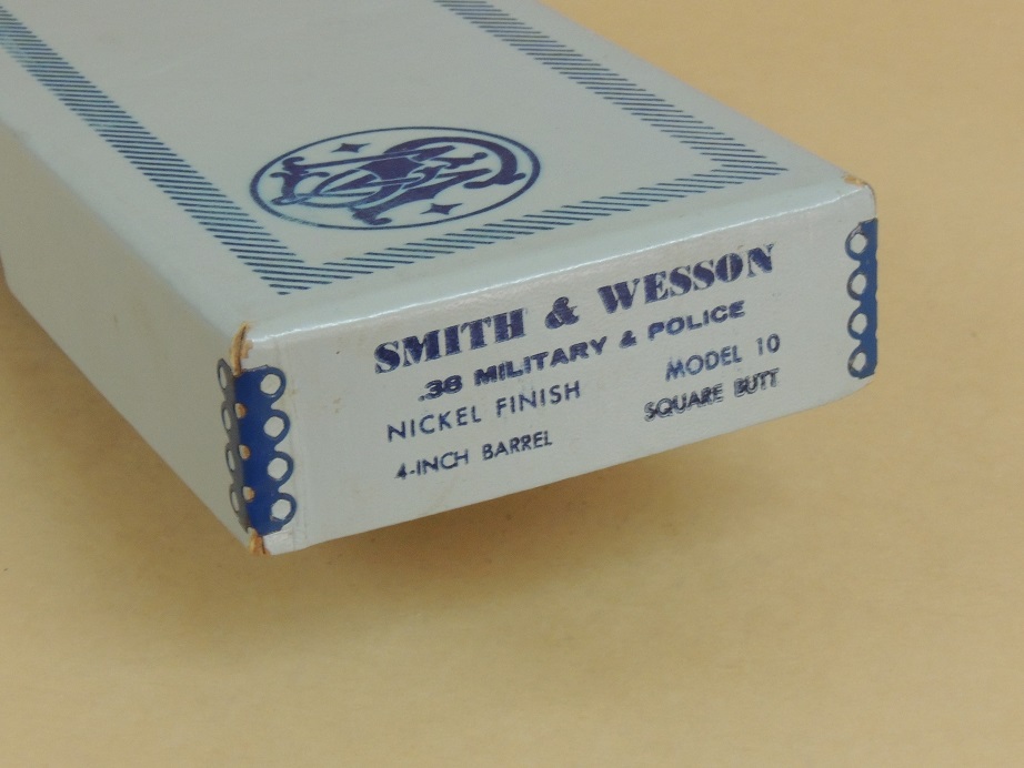 Smith & Wesson Nickel Model 10 .38 Special Revolver in the Box, 4" Barrel, Walnut Service Stocks in the Box, 99%